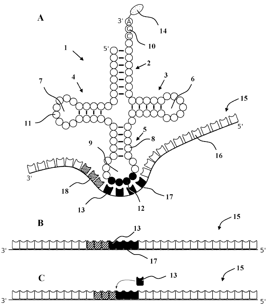 【解決手段】4ヌクレオチドアンチコドンまたは5ヌクレオチドアンチコドンを有する延長アンチコドンループを含むことを特徴とした合成転移RNAであって、コード配列に変異を有するmRNA上のコドン、及び後続のコドン(-1フレームシフトの場合)または先行するコドン(+1フレームシフトの場合)の残りの部分と塩基対合し、担持されるアミノ酸が成長アミノ酸鎖に組み込まれ、リーディングフレームが修正されるフレームシフト変異抑制因子。