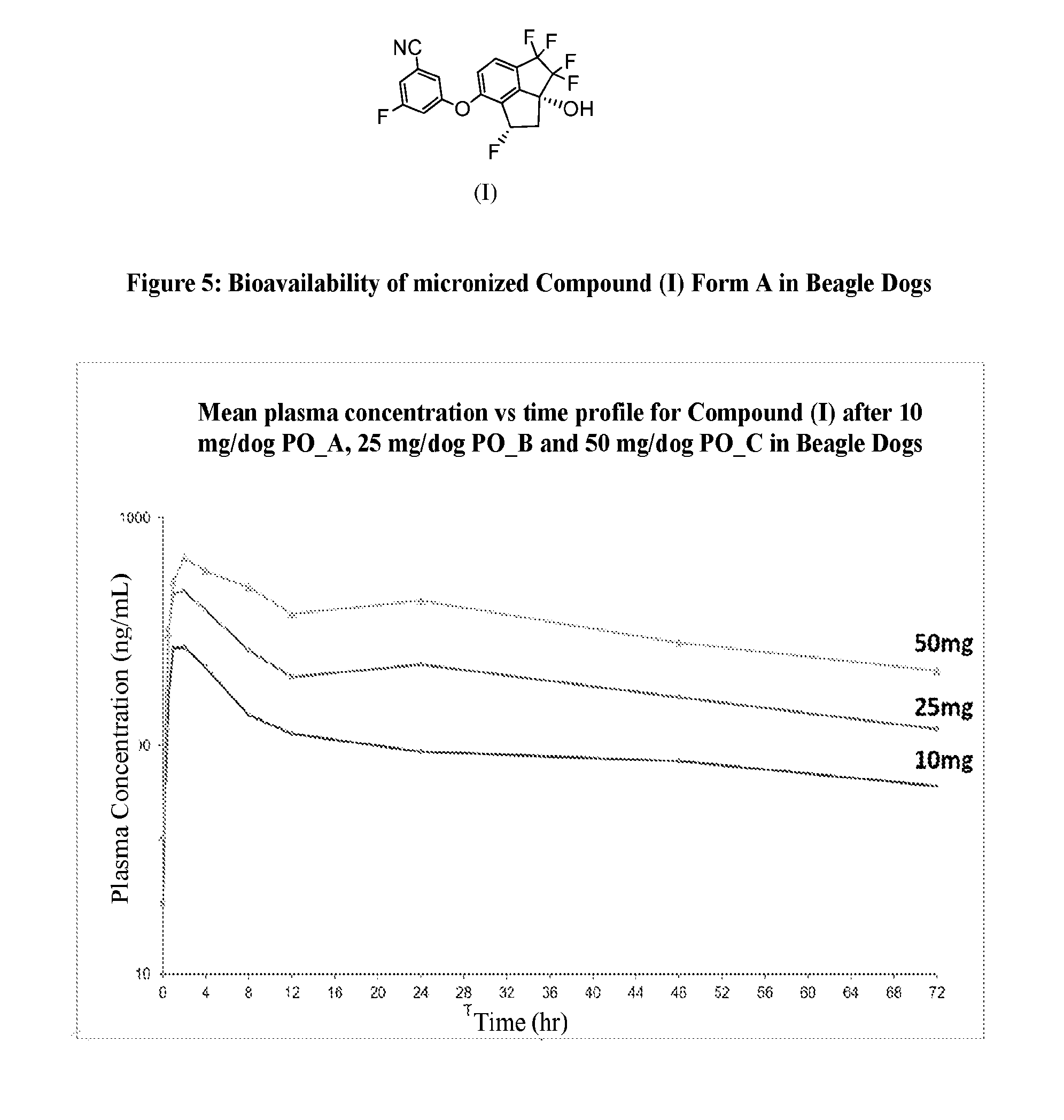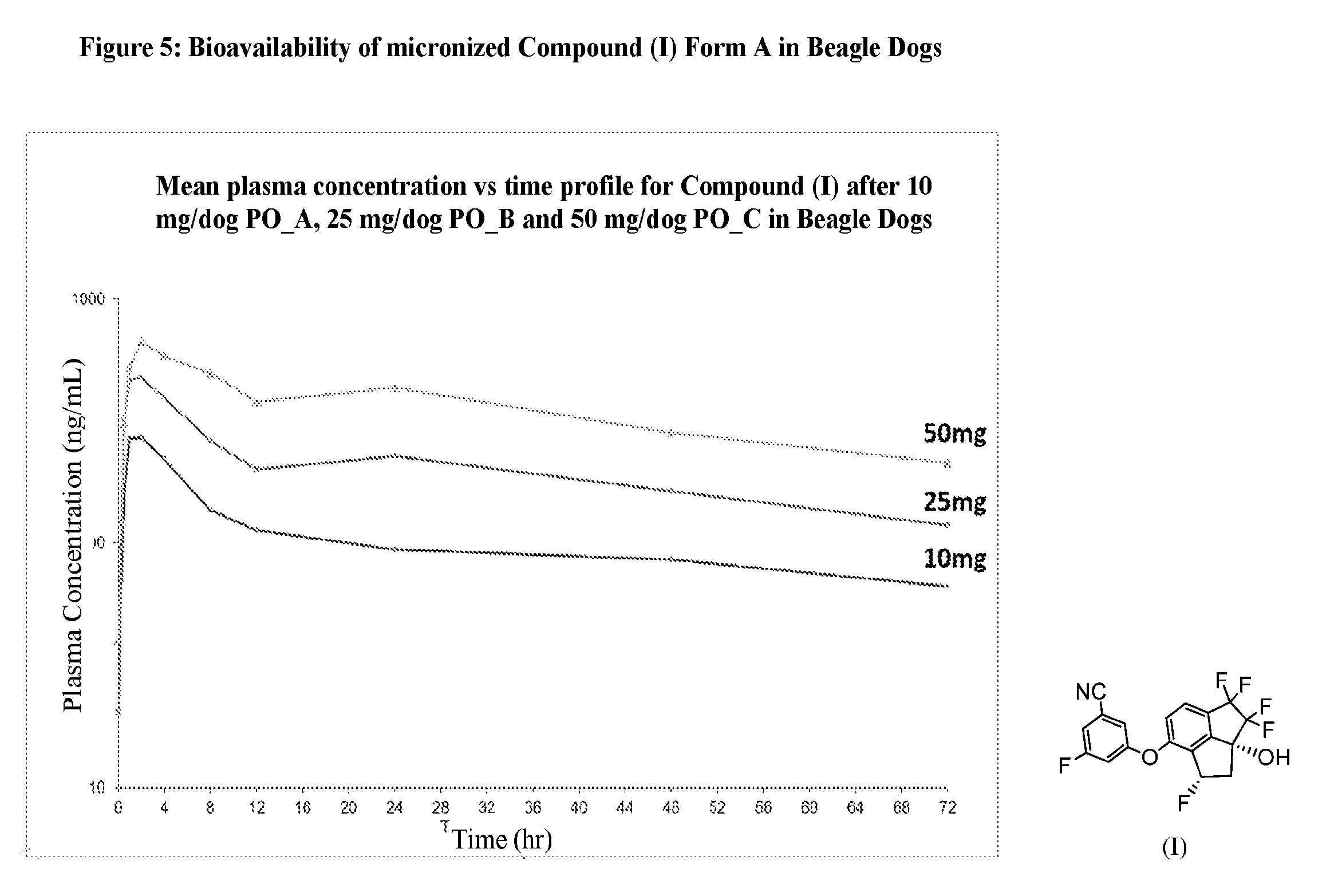 Disclosed herein are compositions and formulations of 3-fluoro-5-(((1S,2aR)-1,3,3,4,4-pentafluoro-2a-hydroxy-2,2a,3,4-tetrahydro-1H-cyclopenta[cd]inden-7-yl)oxy)benzonitrile (Compound (I)), wherein Compound (I) has the structure (I) and methods of making and using such compositions and formulations.
