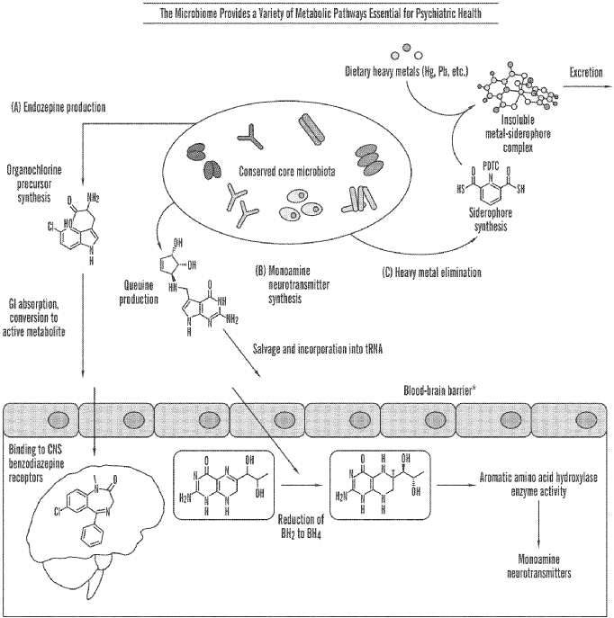 The technology described herein is directed to compositions and methods for treating CNS diseases or disorders associated with microbiome dysbiosis. In one aspect, described herein are compositions and methods for treating CNS diseases or disorders associated with a microbiome deficient in queuine biosynthesis. In another aspect, described herein are compositions and methods for treating CNS diseases or disorders associated with a microbiome deficient in endozepine biosynthesis. In another aspect, described herein are compositions and methods for treating CNS diseases or disorders associated with a microbiome deficient in heavy metal sequestration.